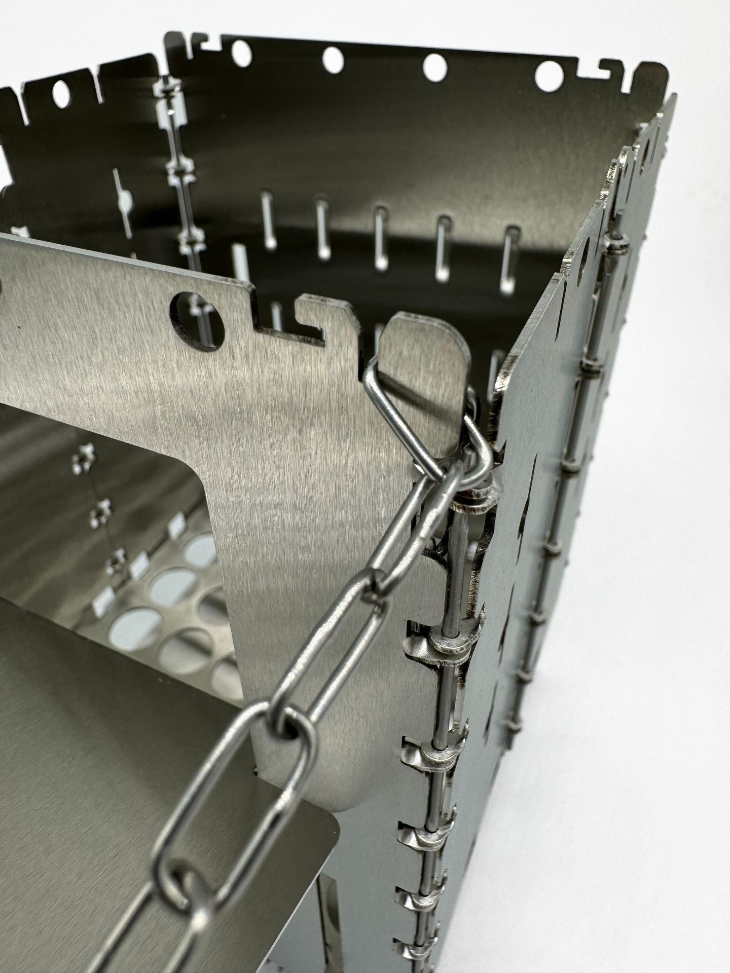 - You can adjust the angle of inclination with the attached chain by hooking it into the groove for the Universal Grate on both sides at the top. For longer and heavier branches, a steeper angle (shorter chain) ensures the wood slides easily and the Bushbox remains stable, preventing accidental tipping.