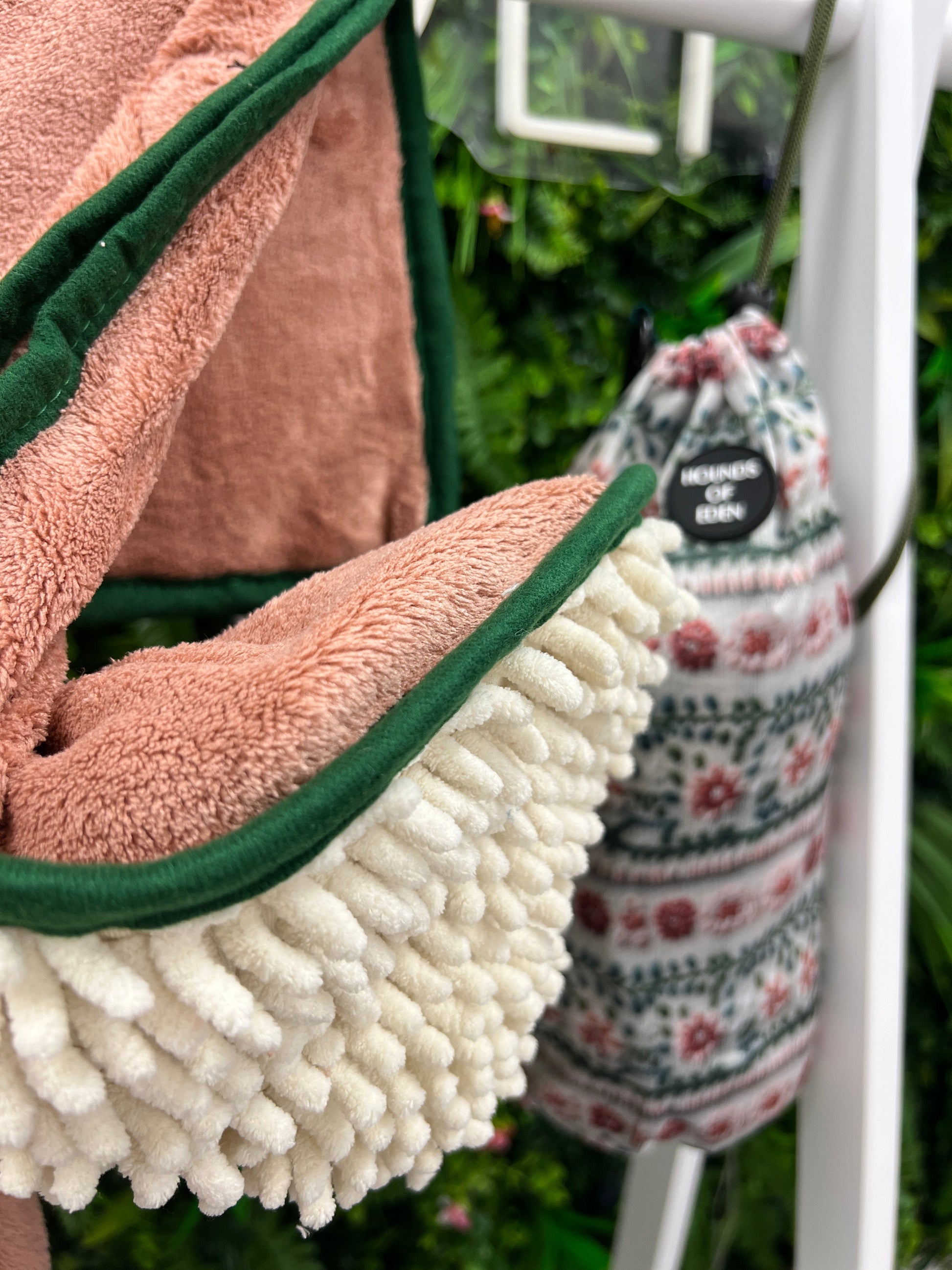 We can add these, so the towel stays on your pup more easily if you wish, creating a drying cape/robe. Please note, due to the size of the towel, we recommend this only for medium to larger breeds where the 105cm length of towel is accommodated with ease.