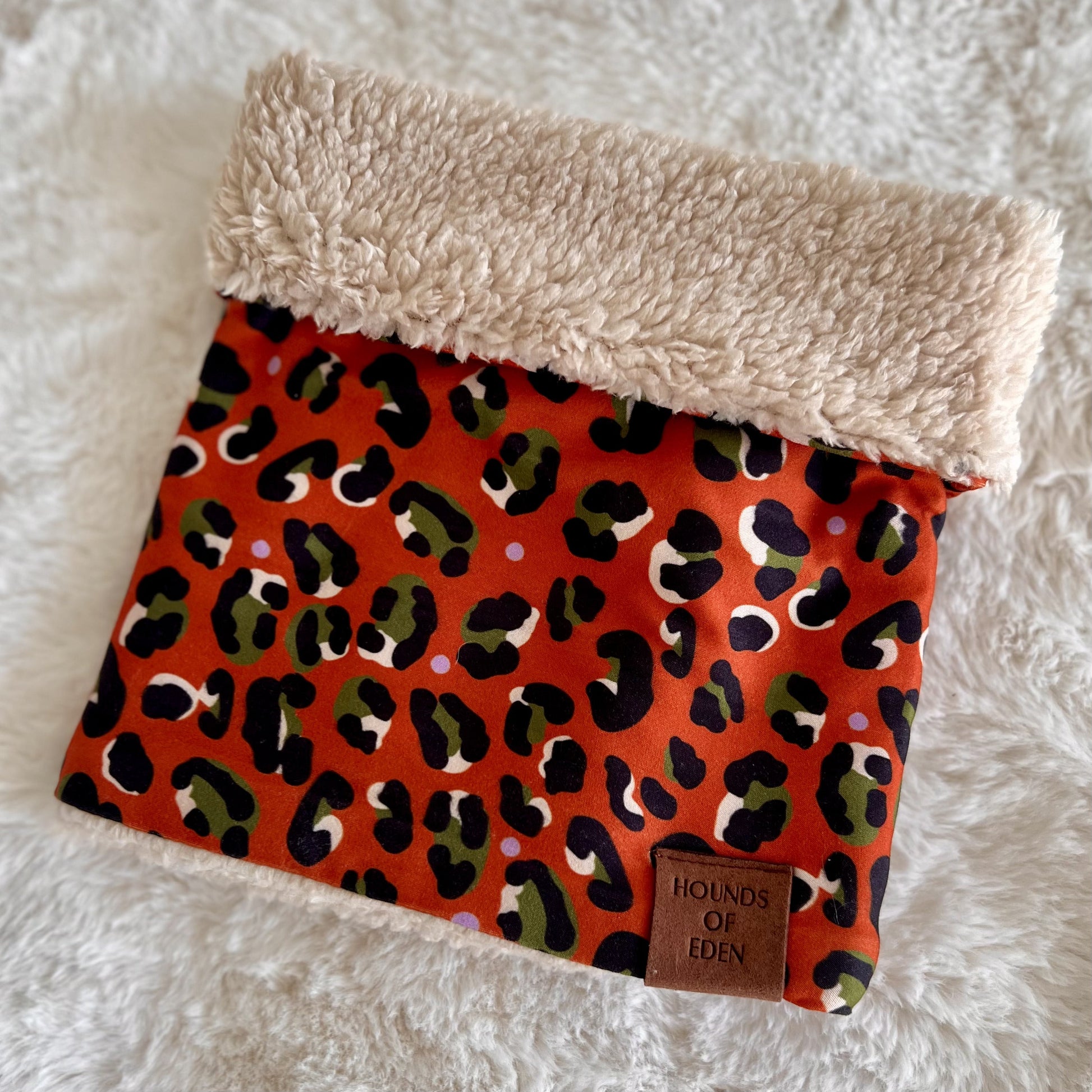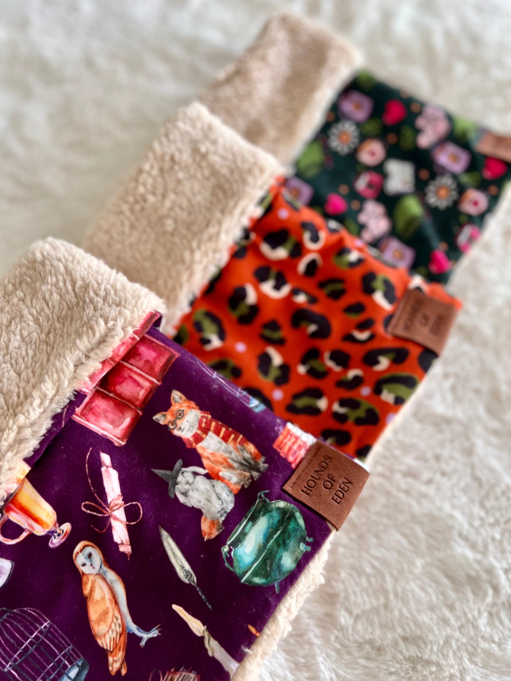 Our snoods are warm, super soft, stretchy and reversible! Made long enough to give full coverage of the neck as well as ears if desired, keeping your dogs ears warm and shielded in the cold preventing ear ache.