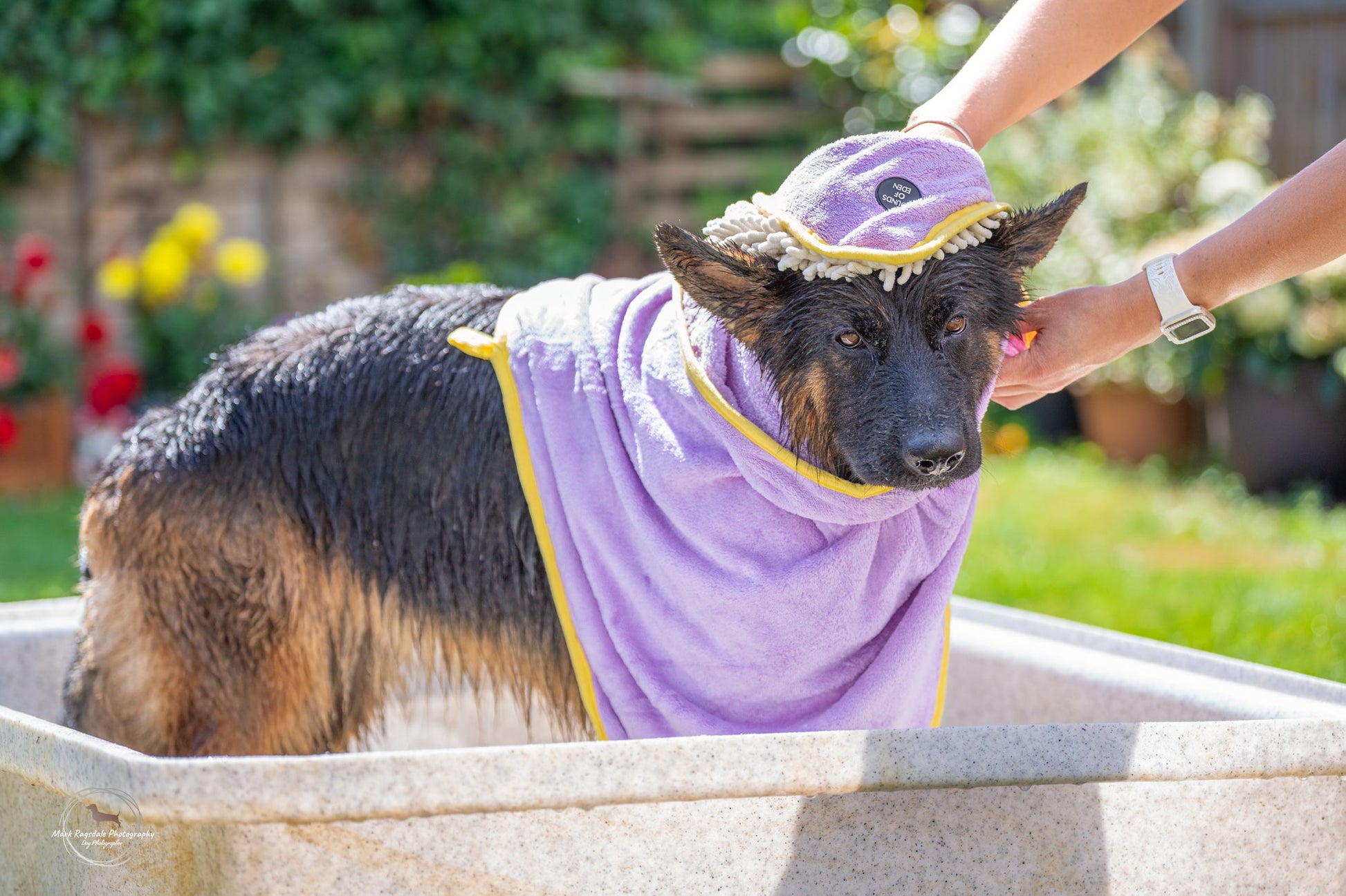 We can add these, so the towel stays on your pup more easily if you wish, creating a drying cape/robe. Please note, due to the size of the towel, we recommend this only for medium to larger breeds where the 105cm length of towel is accommodated with ease.