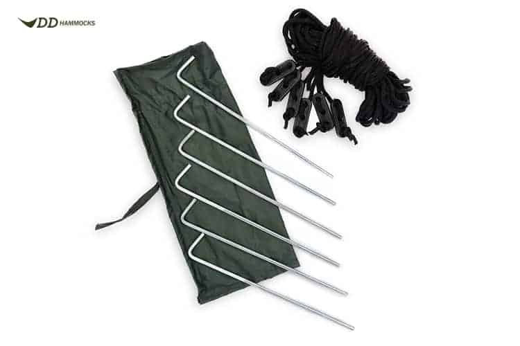 This extra set of 6 pegs and guy lines allow you to add to the 4 sets already supplied with our tarps, so you can truly make the best of your DD tarp's 19 attachment points.