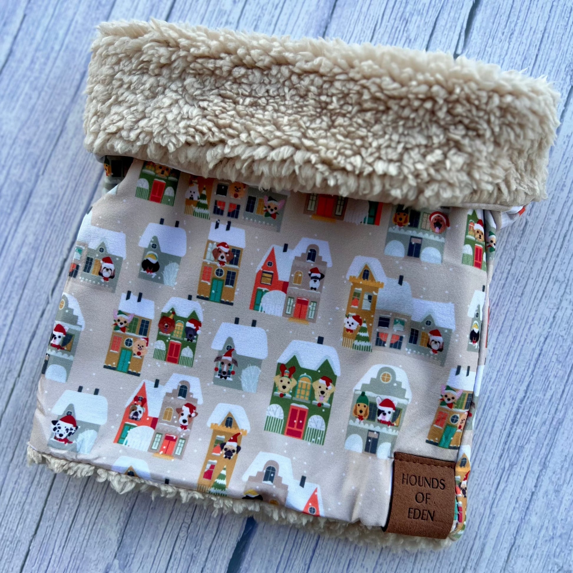 Our snoods are warm, super soft, stretchy and reversible! Made long enough to give full coverage of the neck as well as ears if desired, keeping your dogs ears warm and shielded in the cold preventing ear ache.