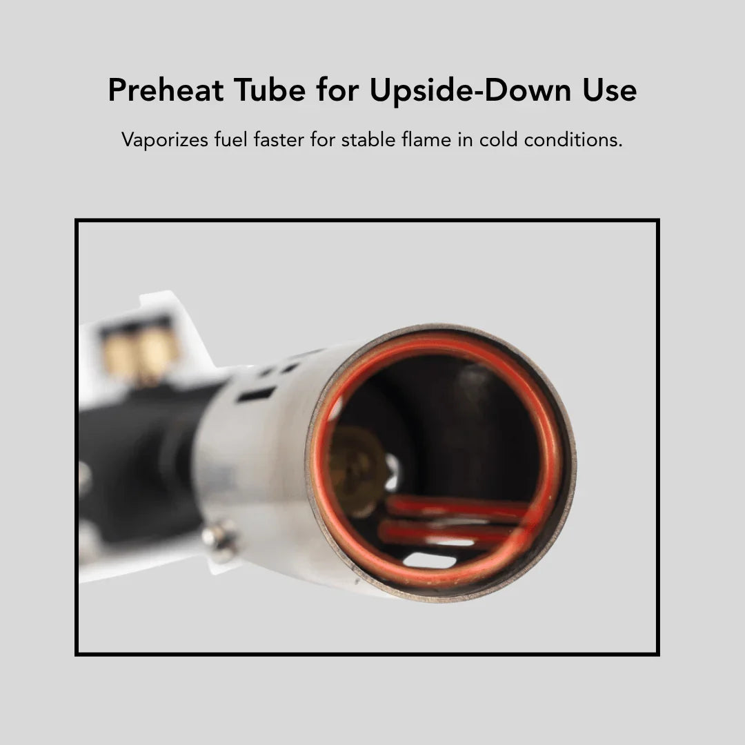 - Need power in the cold? Preheating copper tube ensures efficient gas vaporization—even when used upside down.