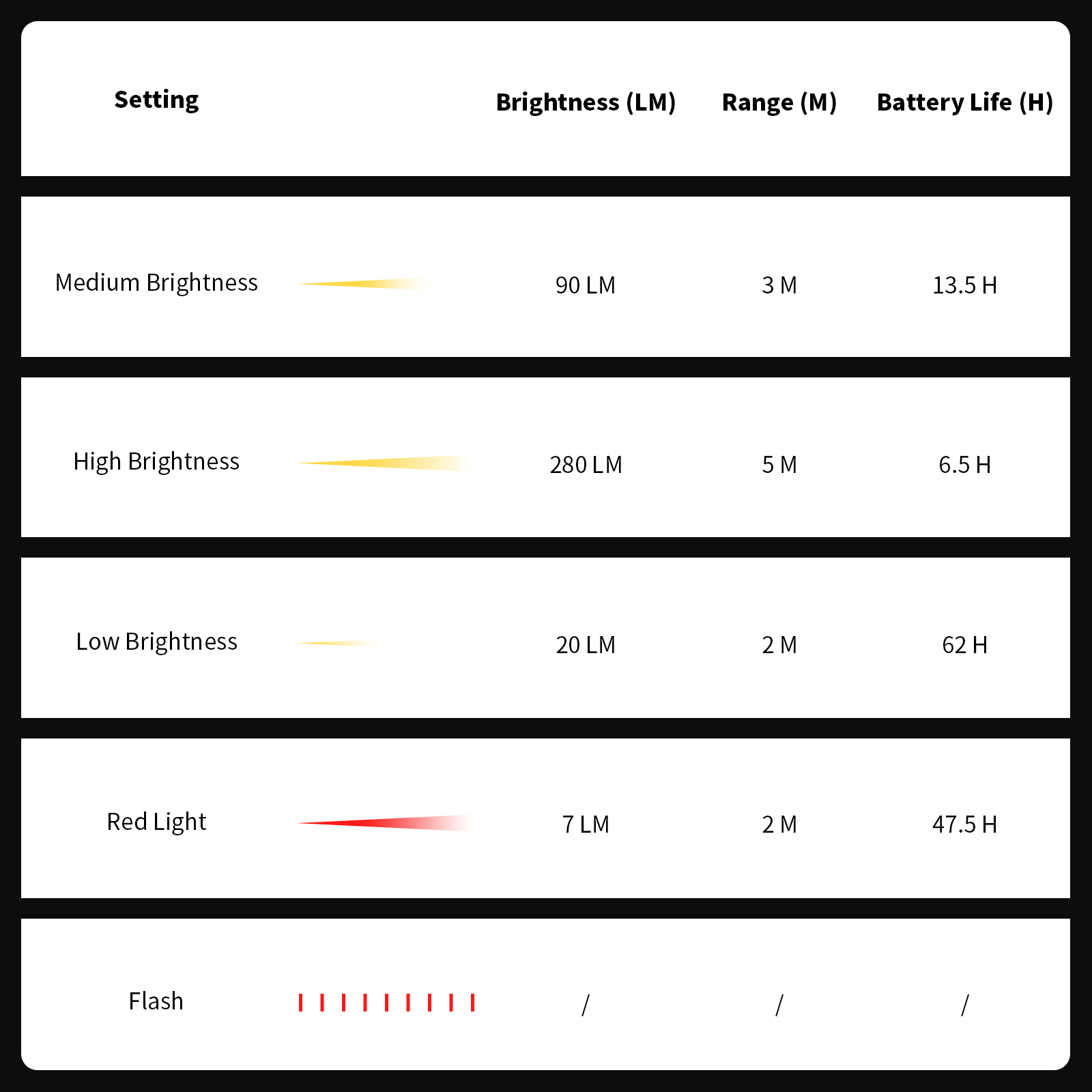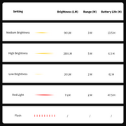 Illuminate every moment to perfection with our five distinct lighting settings. From mood-setting low light to high-intensity brightness, our versatile modes offer tailored brightness, range, and longevity to enhance every outdoor experience. Choose your ideal setting and make every moment outdoors exceptional. |