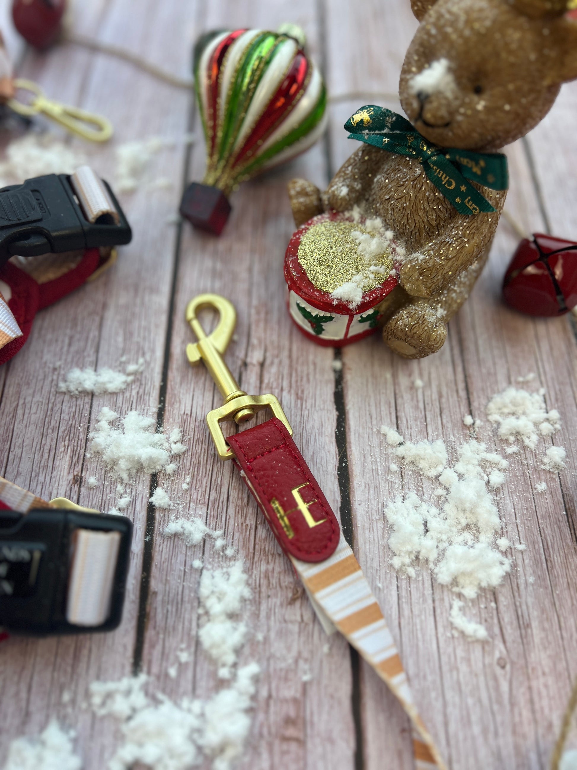A luxe double-sided printed lead with new padded faux leather comfort handle + sleek brushed gold hardware, and gold foil detailing.