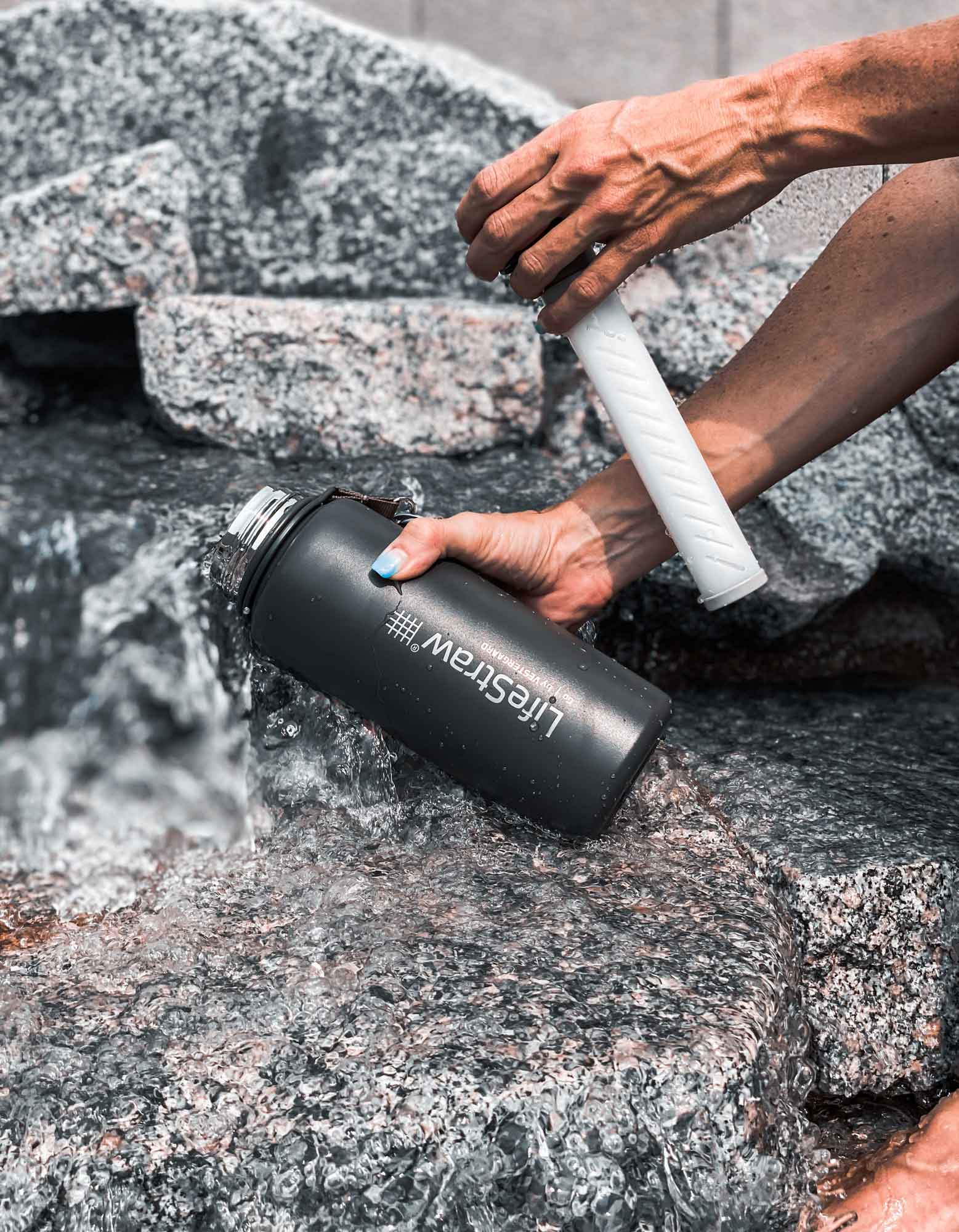 - Includes: water bottle, membrane microfilter, activated carbon filter, cap with silicon mouthpiece, carabiner