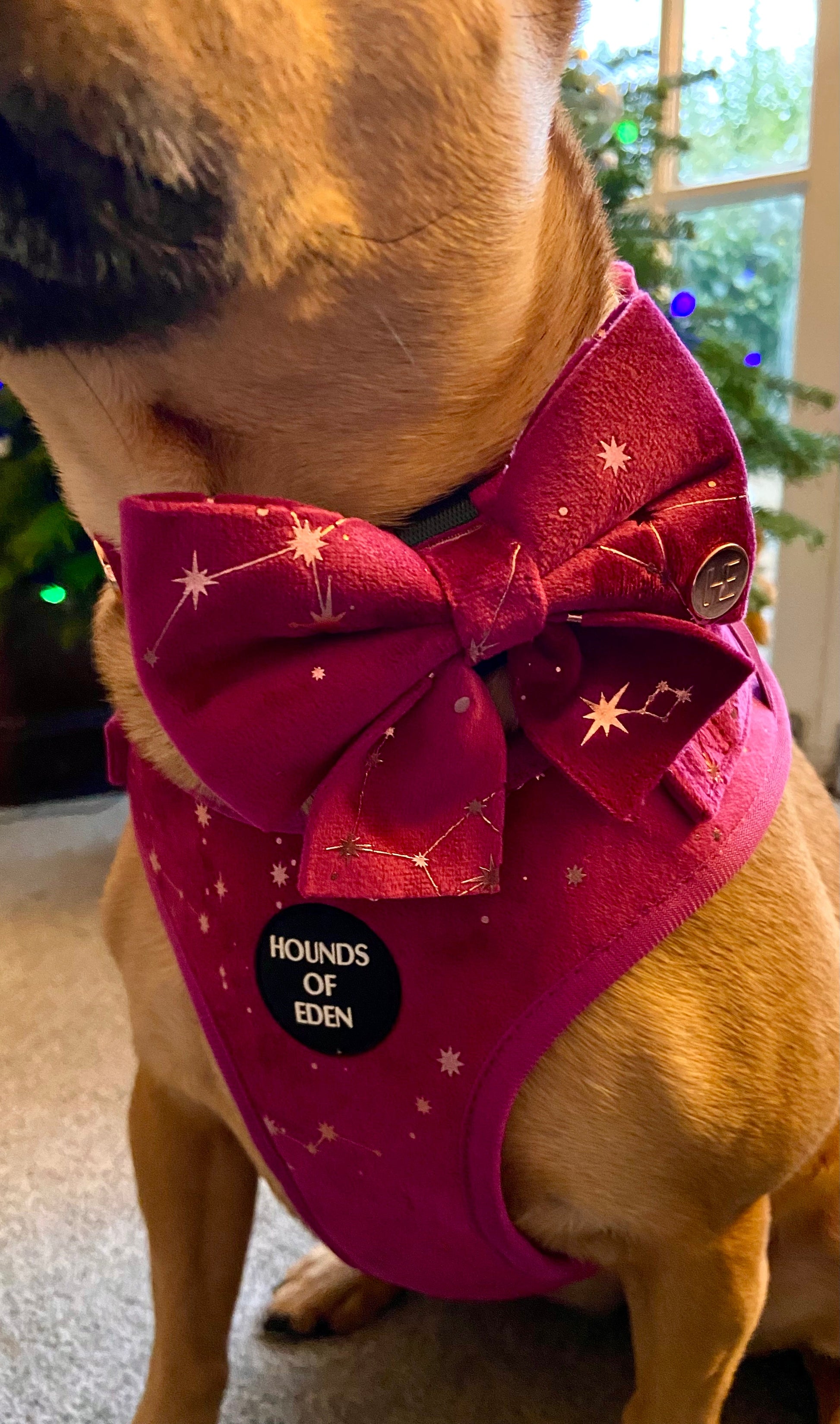 A fully adjustable velvet harness. It is FULLY adjustable in the neck + chest, meaning you can get the PERFECT fit for your dog.