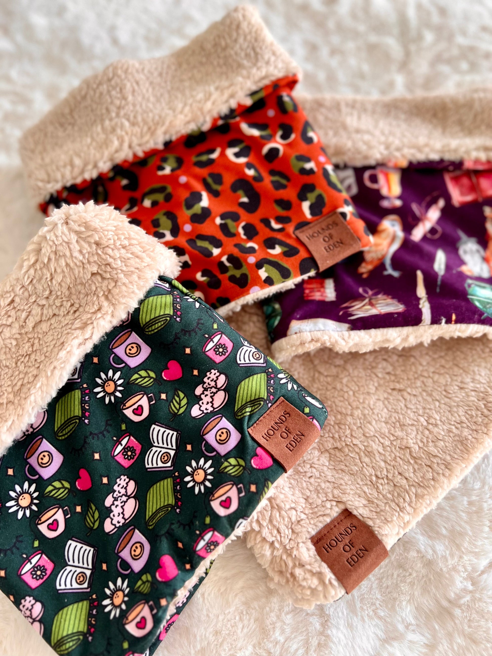 Our snoods are warm, super soft, stretchy and reversible! Made long enough to give full coverage of the neck as well as ears if desired, keeping your dogs ears warm and shielded in the cold preventing ear ache.