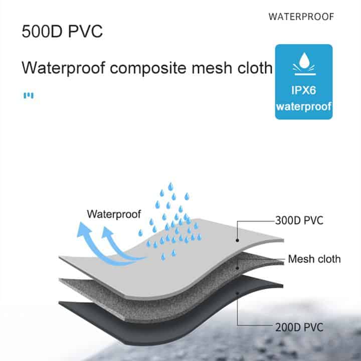 - 500D PVC waterproof composite sandwich cloth. Thickened 500D PVC waterproof composite sandwich cloth, environmental protection material, good waterproof effect.