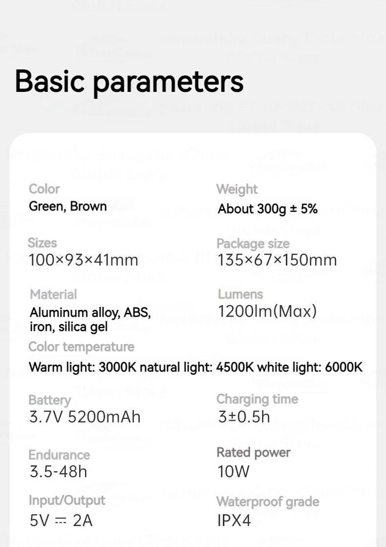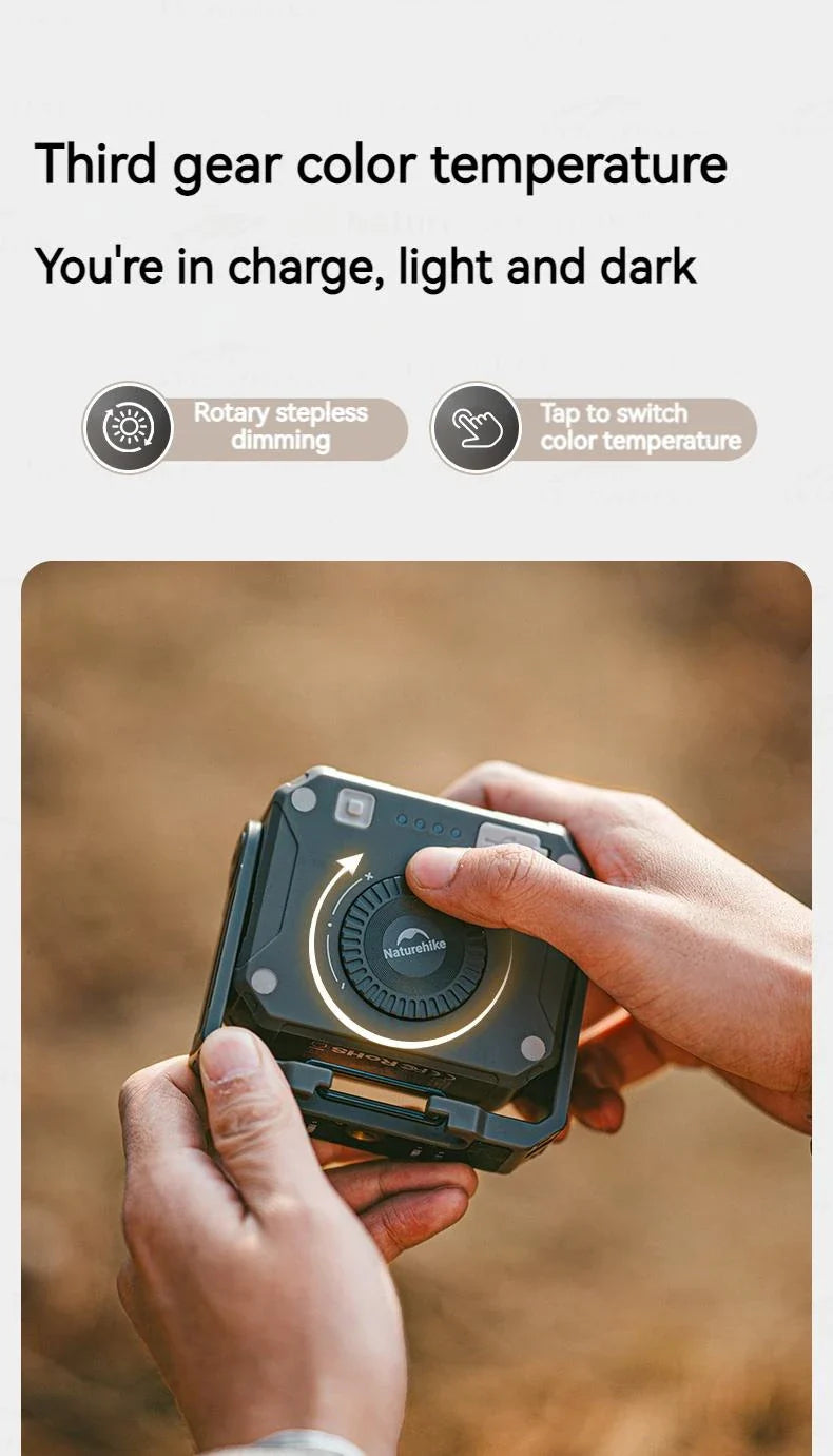 The Naturehike Camping Floodlight with White and Red Light with a maximum of 1200lm powered by a 3.7v Rechargeable battery via USB C port.
