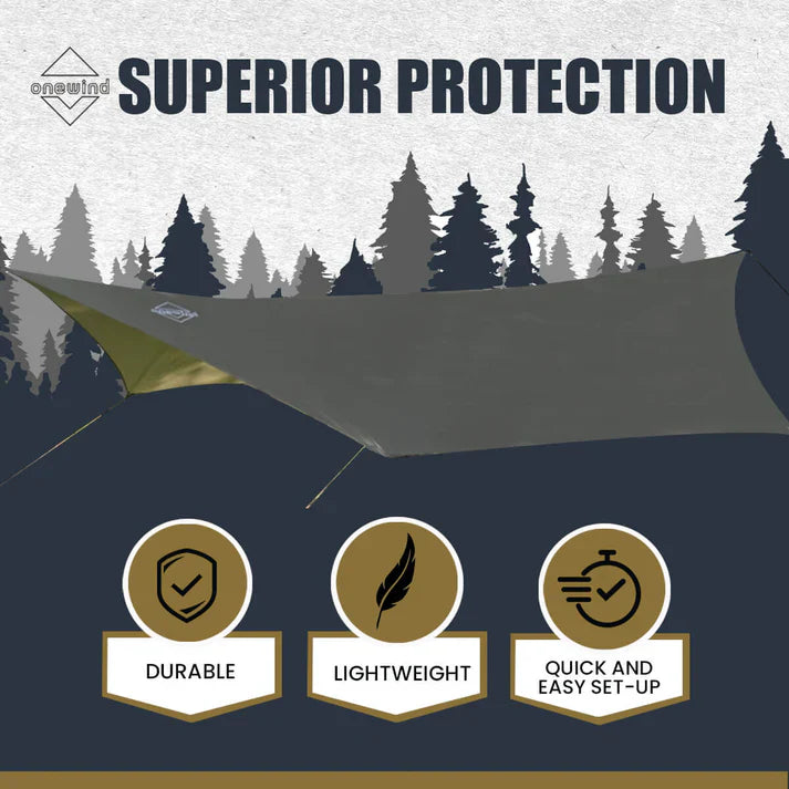 This hammock tarp shelter from Onewind is the perfect addition to your camping gear. It will keep you dry and comfortable in wet weather while keeping your pack weight as low as possible.