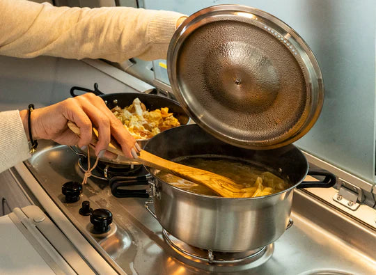 The Petromax cookware was developed to meet the needs of the adventurous. It is lightweight and particularly space-saving. The foldable, heat-insulated handles make handling easier, while the scratch-resistant coating ensures perfect cooking results. There is a scale on the inside of the pots to help with preparation, and a pouring aid is also integrated into the lid.