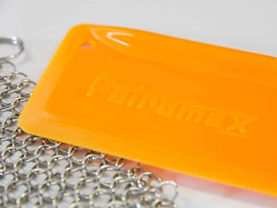 Handy scraper that removes cooking and frying residues from hard to reach areas of Dutch Ovens and Fire Skillets. The scraper cleans cast and wrought iron without attacking the valuable patina, for it adjusts perfectly to the inside of Dutch Ovens, Fire Skillets and Loaf Pans. The scraper is made of food-safe plastic and is heat-proof up to 248 °F (120 °C). The versatile kitchen utensil is also suitable as an outstanding dough scraper or spatula for dividing dough into portions.