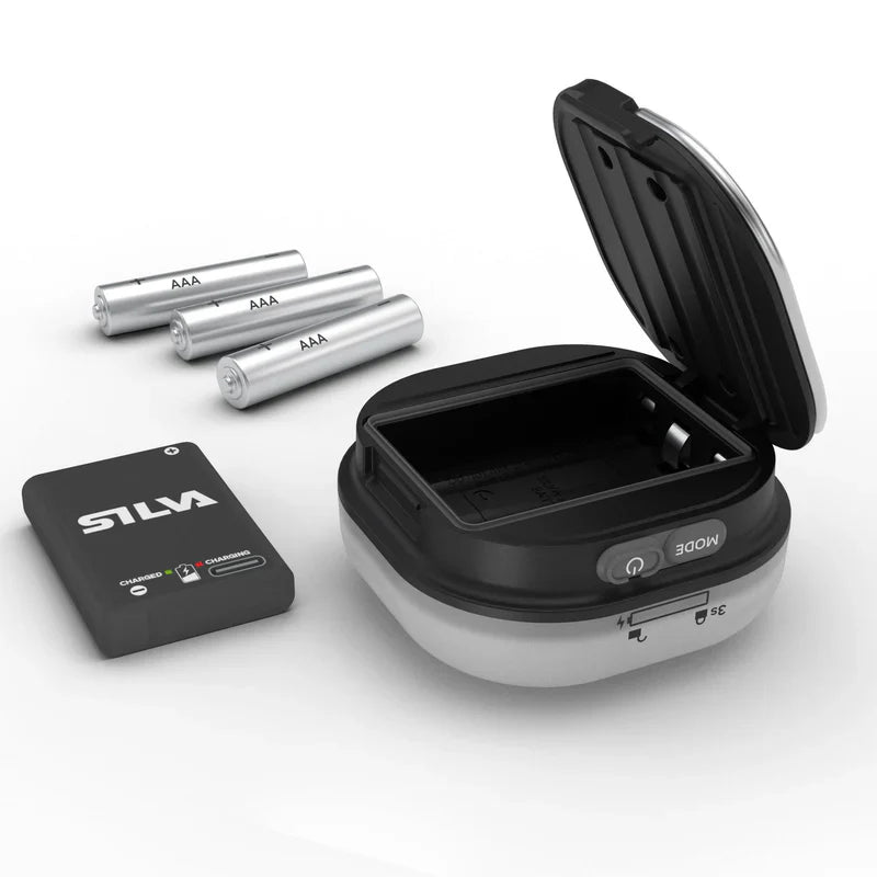 The Glow camping lantern offers 250 lumens light output with a frosted lampshade that creates a warm and bright 360° glow. It has two light modes—cool white and warm white—for different situations. The cool white light is an efficient work light when setting up camp, cooking, or organizing, while the warm white light creates a cosy campfire glow for relaxing, socialising, or reading. Both light modes feature four brightness levels, including a super low and battery-saving 5-lumen mode. Glow runs on both AAA batteries and the Silva Hybrid Battery.