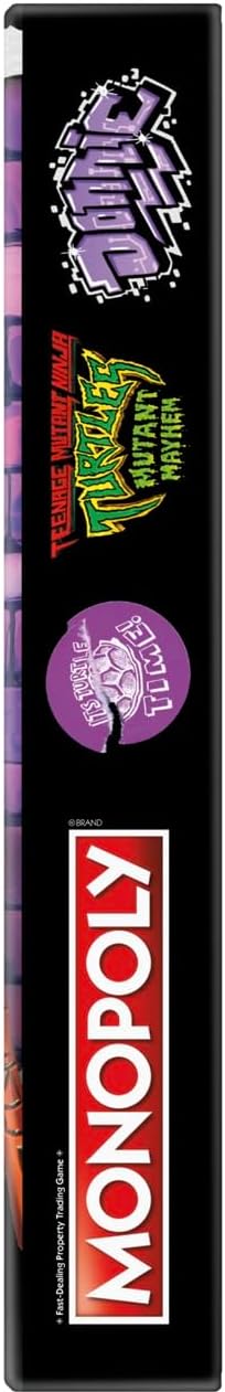 - TMNT MEETS THE MONOPOLY GAME: Battle mutants with your Turtle powers! This Monopoly Teenage Mutant Ninja Turtles: Mutant Mayhem Edition game features characters and artwork inspired by the movie| COLLECT PIZZAS TO EARN POINTS: In this fun kids board game pizza replaces cash. Players travel the board buying properties—locations from the movie! The more they own the more pizza (and points) they can collect| BATTLE EVIL MUTANTS: Pass or land on GO to battle a legendary mutant. Beat that mutant and get a bodacious bonus! The game ends when the final mutant battle is over. The player with the most points wins|ACTIVATE A NINJA ABILITY: Roll the ninja action die along with the numbered die to activate a Turtle’s unique ninja ability. Each Turtle gets a special boost when they roll certain ninja abilities|PLAY AS A FAVORITE CHARACTER: Character tokens include Leonardo Donatello Raphael and Michelangelo! When players land on the Turtle Power board space they activate their Turtle’s unique ninja power| FUN GIFT FOR KIDS: This fun board game for families and kids makes an awesome gift for Teenage Mutant Ninja Turtles fans Monopoly game fans and gamers ages 8 and up